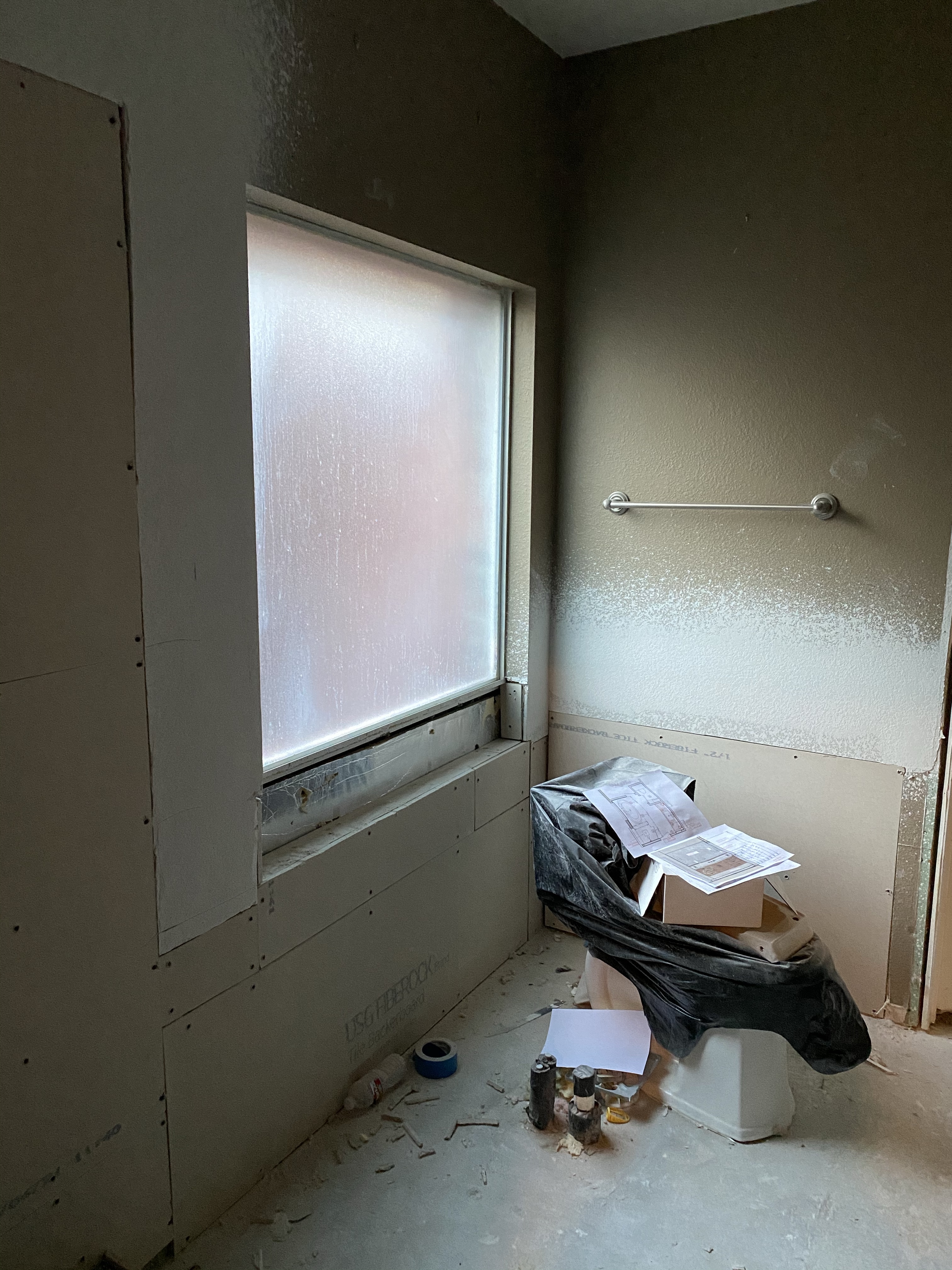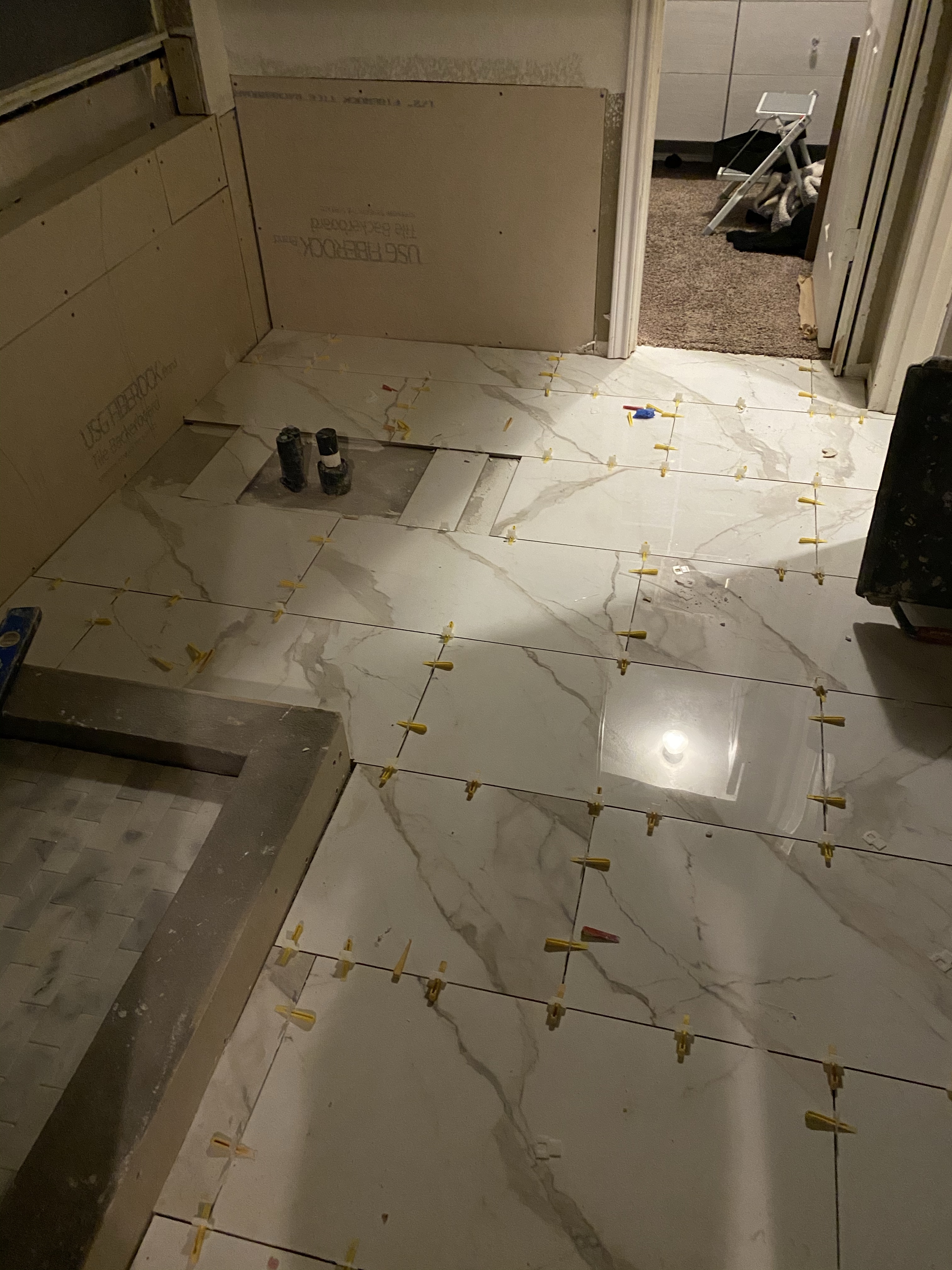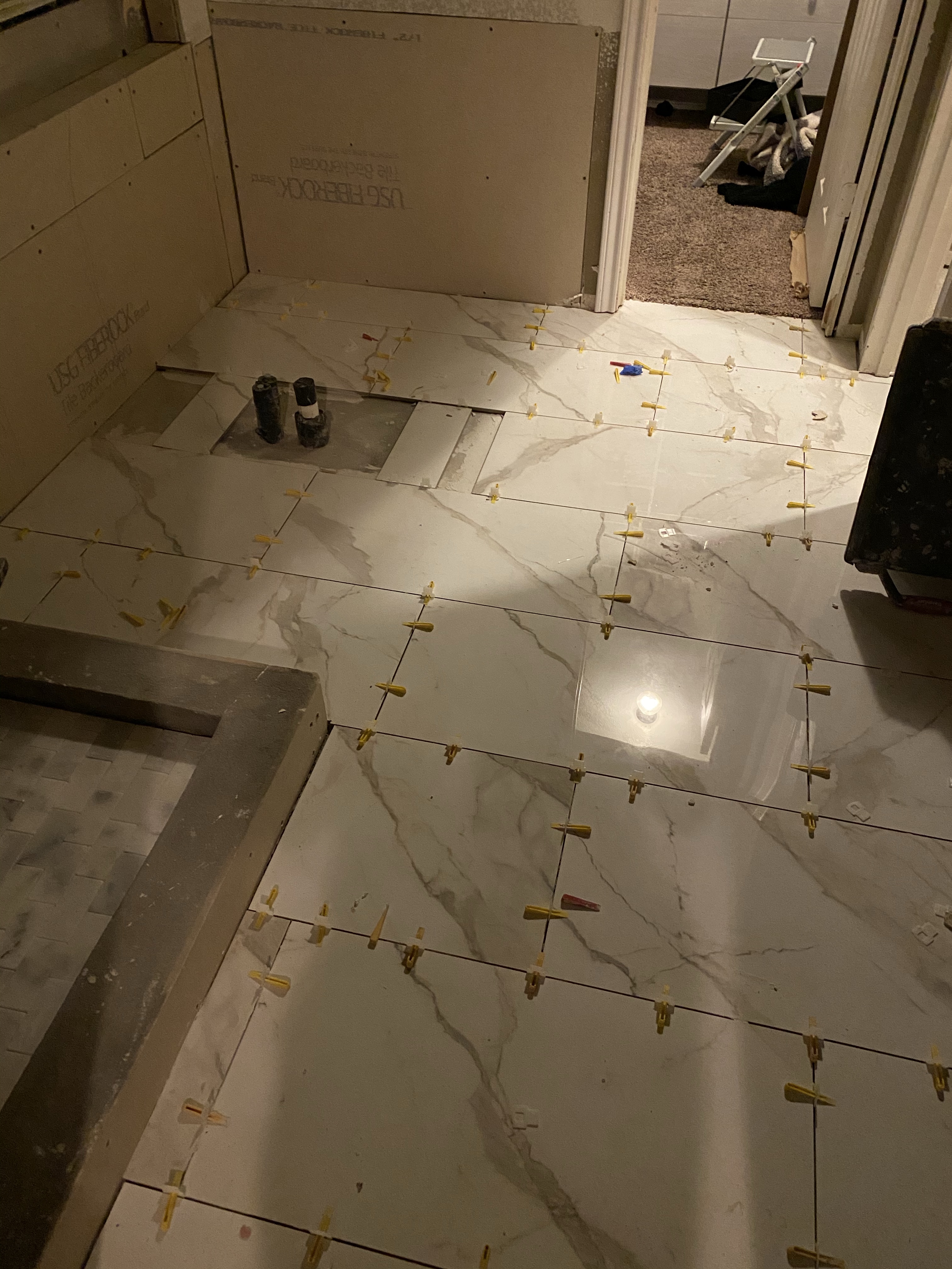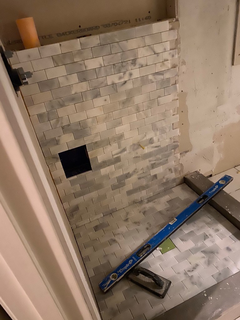 We are now two weeks in on the bathroom remodel! We have newly installed can lighting throughout the bathroom, no more outdated lighting fixtures above the mirror! They have started moving on laying the tile and seeing my choices together is ๐ฅ. We are also going to re paint the master bedroom next to the bathroom to give it a freshness. Rhonda is an interior designer who works with our contractor Craig and made this suggestion. She said that often when a remodel of one room happens the other rooms may feel sad and old. The fresh set of paint and some new window treatments will tie the new with the old. We are excited to see what they will be working on next week. Craig has texted me daily to know what to expect so there are no surprises. This has been very helpful. More details to come as we move along in this process. โค๏ธ