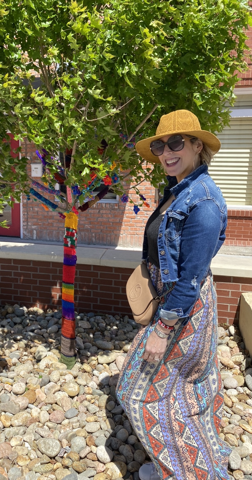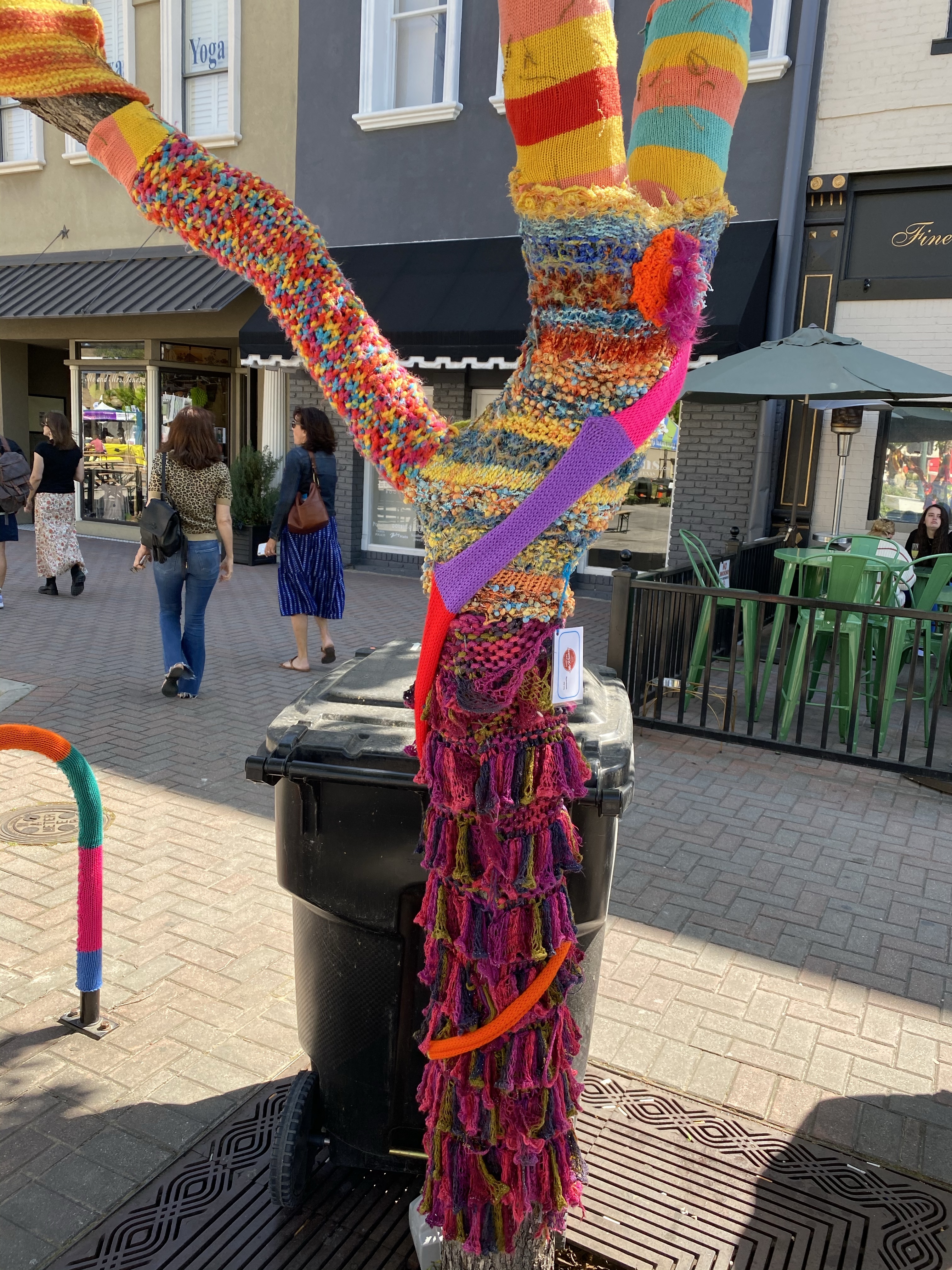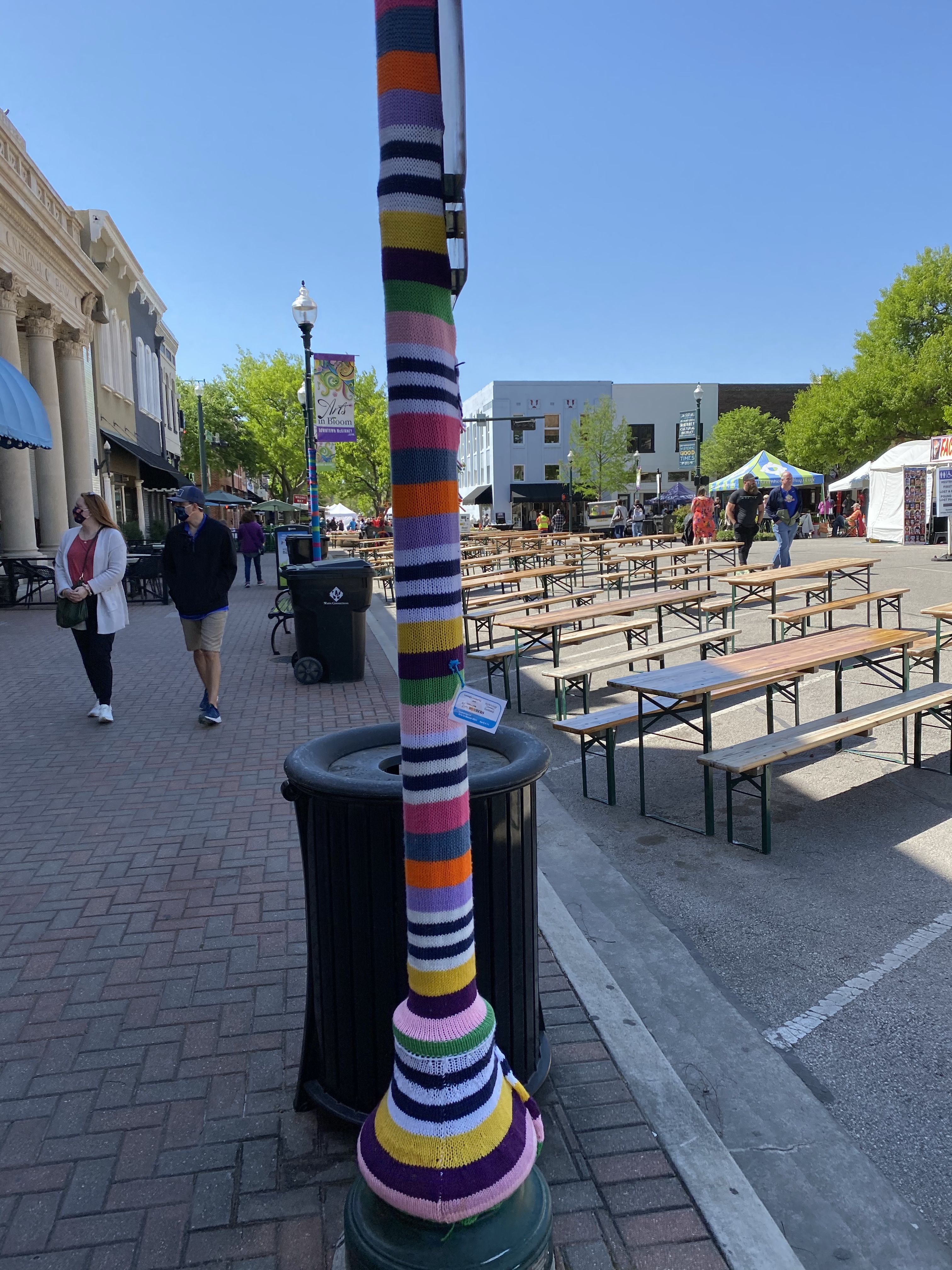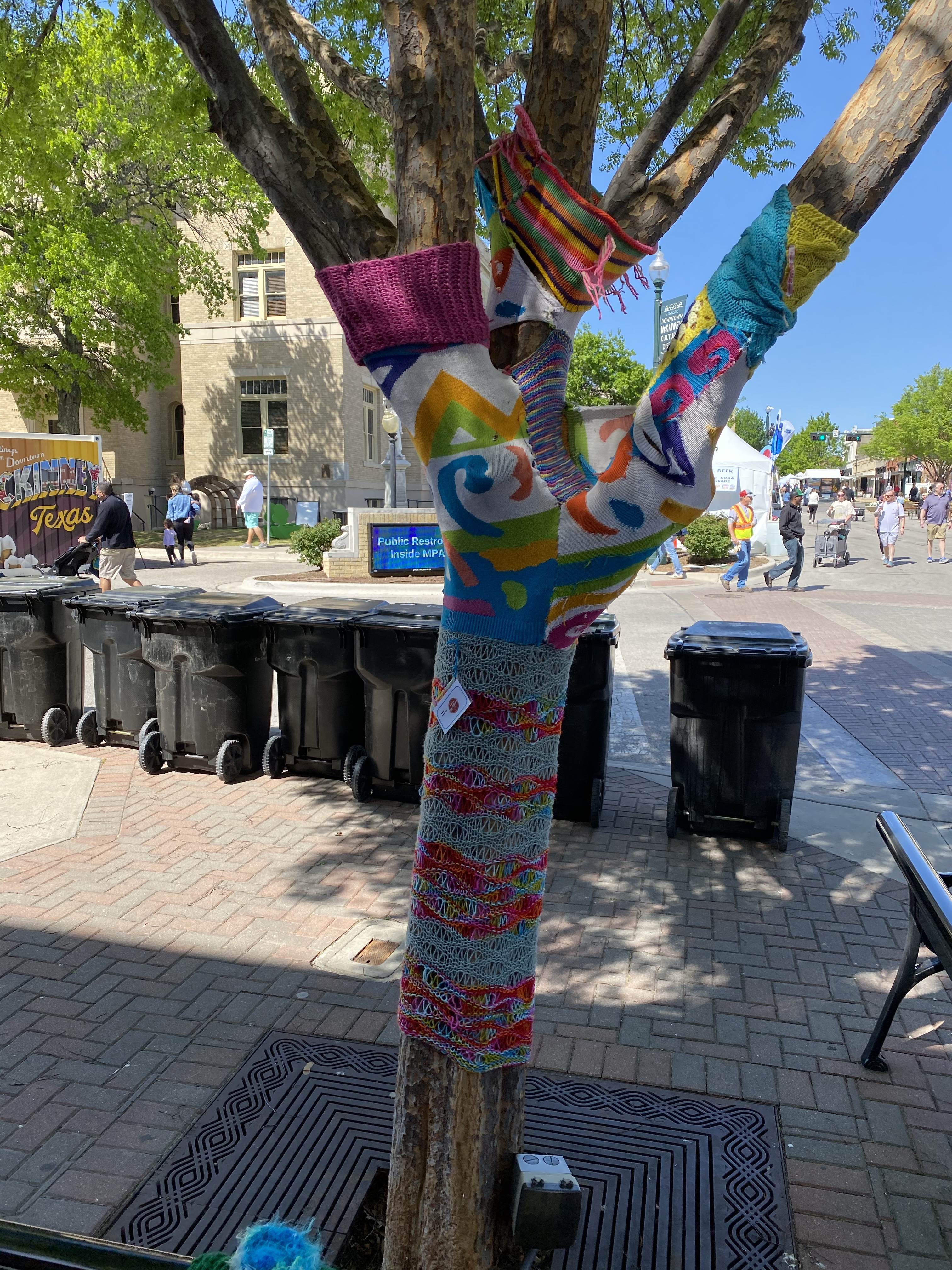 I recently came across a feed on social media that showed some local artists decided to “Yarn Bomb” trees and benches and other things in downtown McKinney. I told the hubby we def needed to go check it out! As soon as we got to downtown McKinney, we realized that they were having a fair with local artists in stalls…even better!! First, we met my sis for brunch and hit up the The Yard. We started with the waffles fries smothered in queso, pulled pork, cojita cheese and jalapeños. Sooooo dayum good! The Bloody Mary’s were strong and spicy 🌶 and the day was beautiful on their big patio. For entrees, I had the crispy chicken sammie with pimento cheese and peppers and a side of the garlic green beans and the hubs got the nachos (they were HUGE) with queso and pulled pork. Next, I ordered the Watermelonade consisting of Grey Goose Watermelon Basil Vodka, Lime, St-Germain, Watermelon, Mint Simple Syrup. Very refreshing and STRONG 💪 . Everything was delish and we were stuffed! We decided to walk around, let our tummies rest, and check out the art. So many talented folks from word working, jewelry, photography, painting and various other crafts. We also stumbled into a cool antique shop and picked up a nifty vintage bourbon 🥃 decanter. We always stop at the Spice & Tea Merchants to grab their Olive Texas Ranch roasted garlic olive oil. So yummy for cooking vegetable and even eggs! Our last stop happened to be at a jewelry stall where we met Heather from Modern Artifacts and her gorgeous pieces! She explained to us about her jewelry making journey and how she learned metal work in high school and combined her archeology roots to inspire her work. I got a gorgeous mini vessel necklace and turquoise evil eye earrings. Our day in dt McKinney quickly came to a close and on our way home, we picked the kiddos up the requested Chick-fil-A late lunch. Now off to nap the afternoon away before tonight. Ciao!