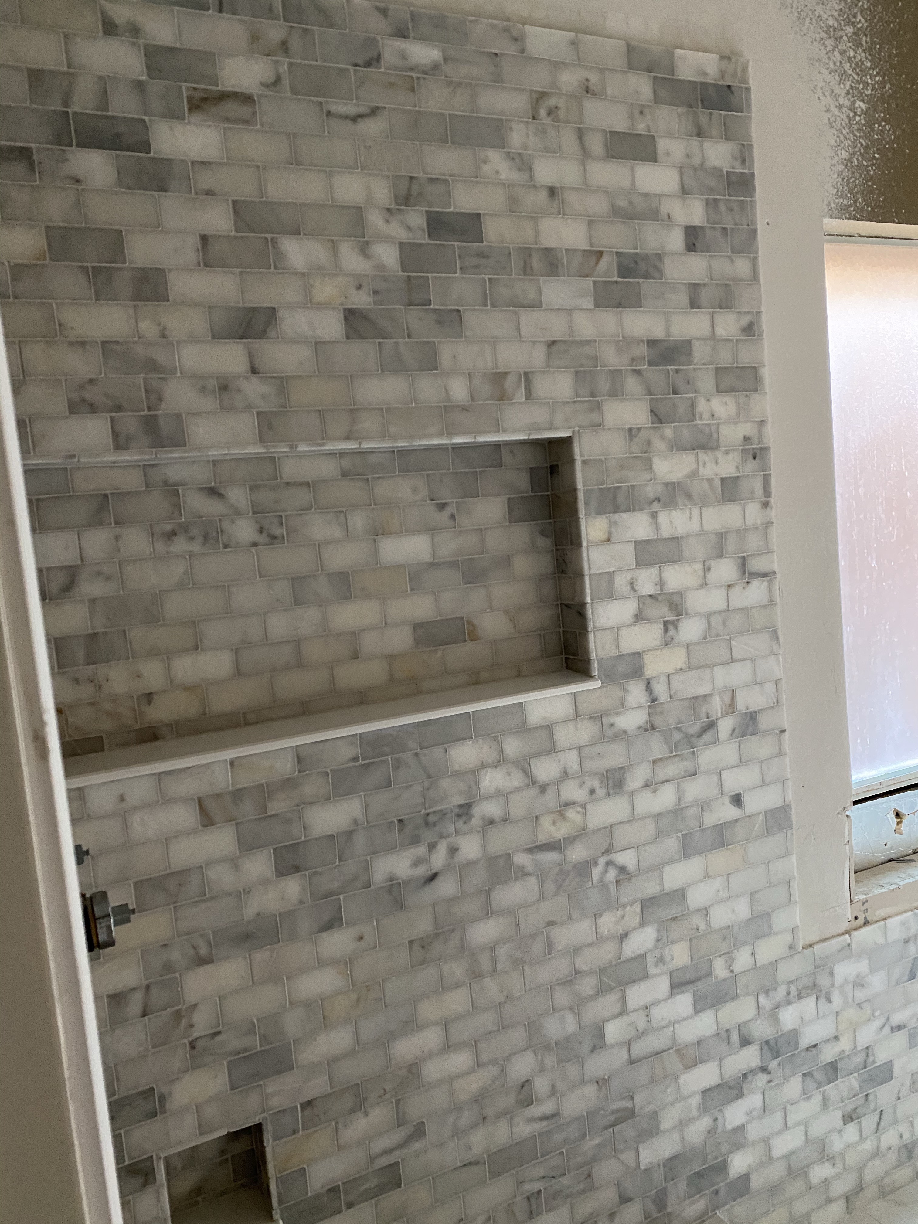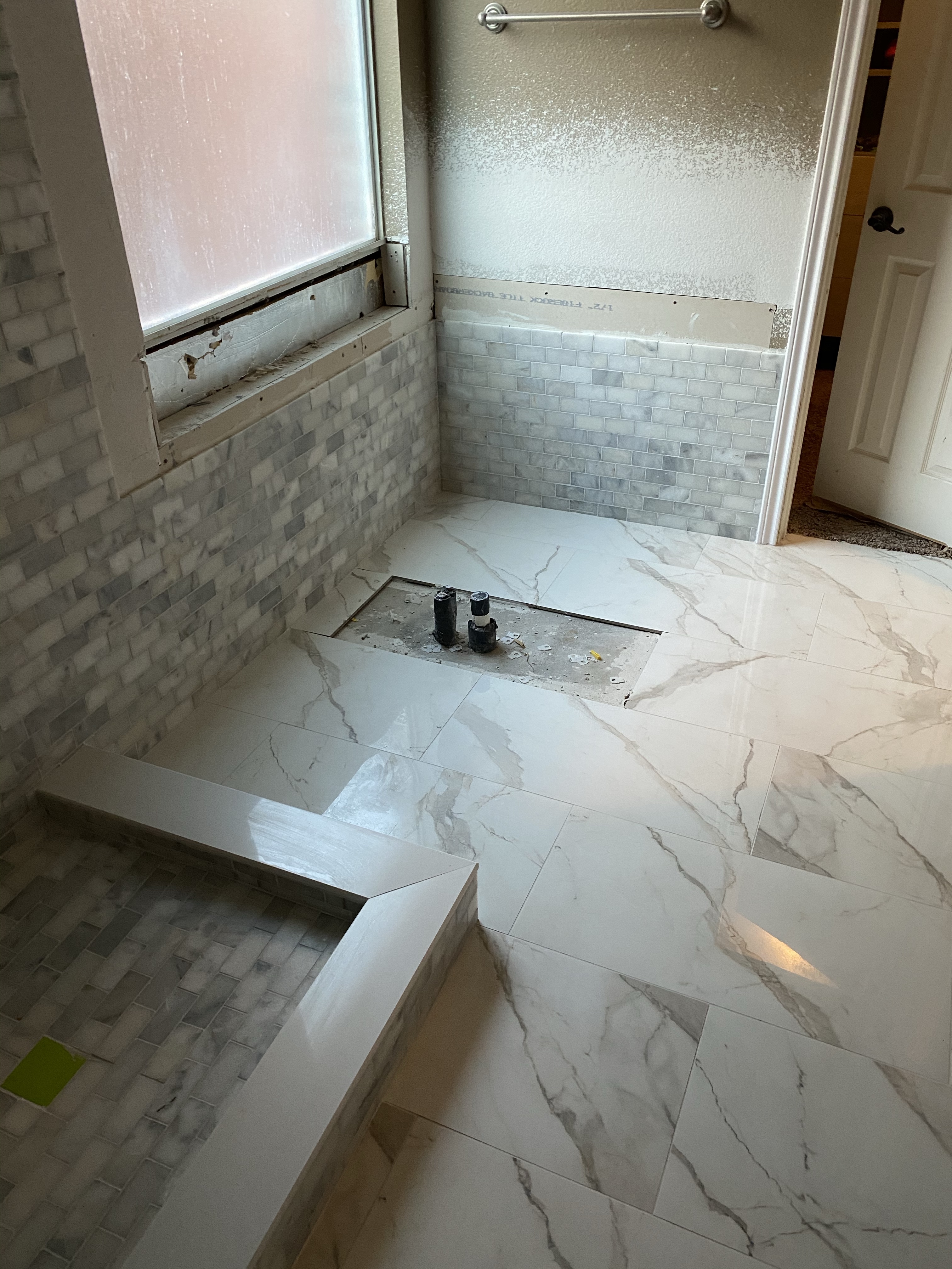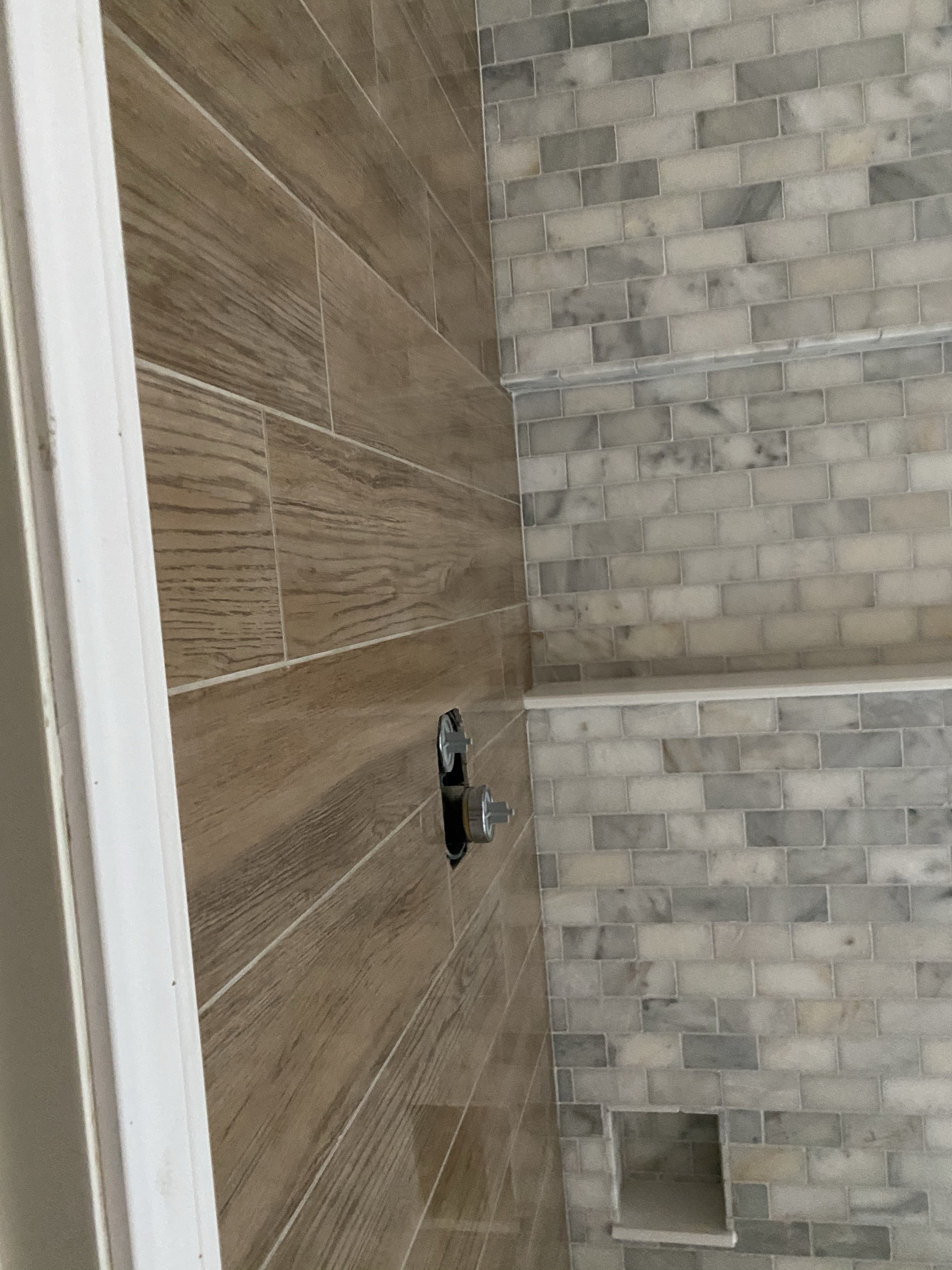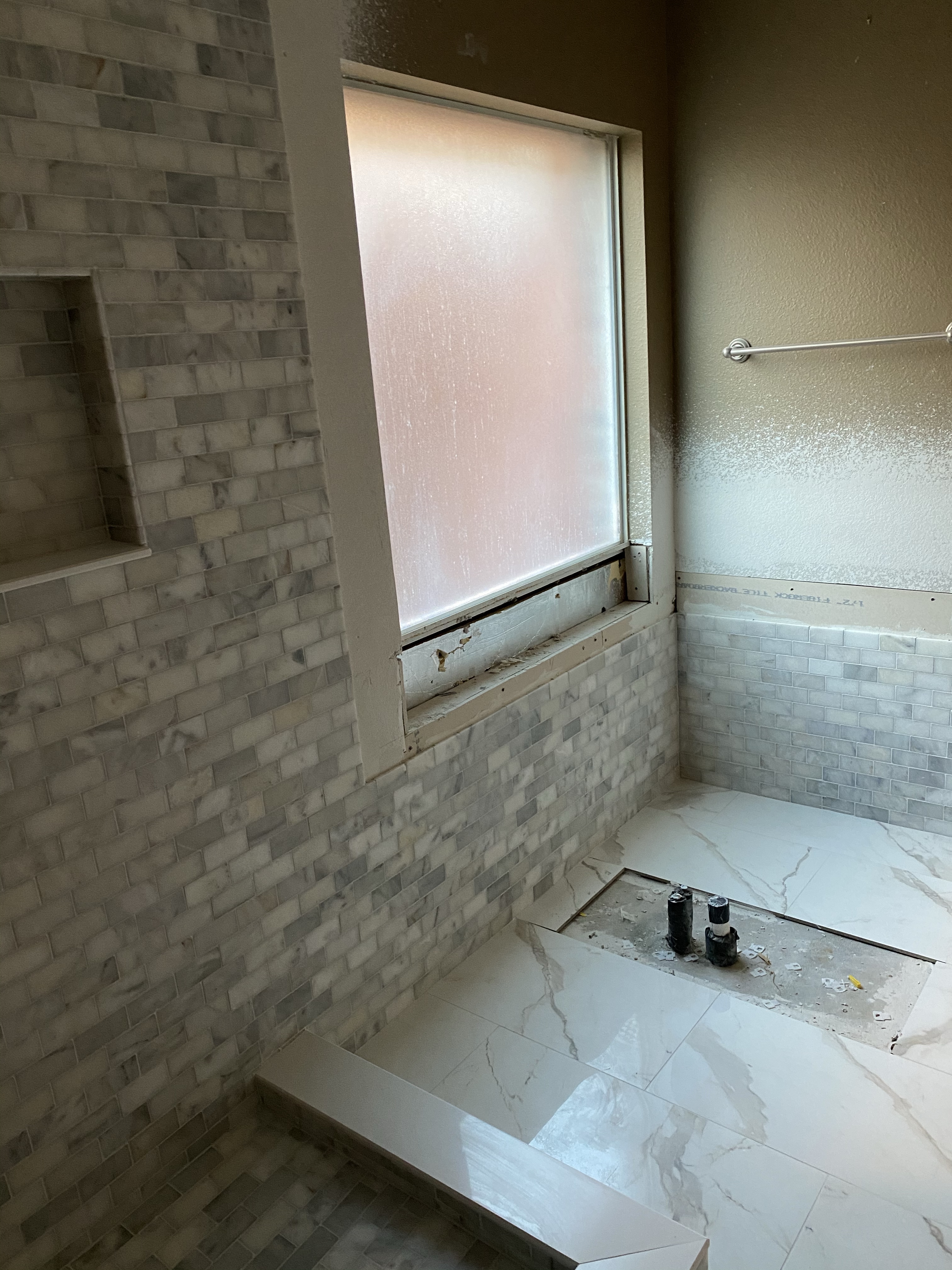We have paint and a cabinet!!! Our contractor had this cabinet made for us and I LOVE the color. It pairs so well with the wood tiling that we ended up using on one wall of the shower. Just like Rhonda the design expert said, “it warms up the space.” I love how the beige tones on the floor compliment the wood accents. It’s really fun seeing all the choices and decisions come together. The little cove in the shower is supposed to have the paneling too and our contractor quickly let us know that it would be changed. I can already tell that the brushed gold fixtures are going to be GORG with once it’s all in. Until next time!!